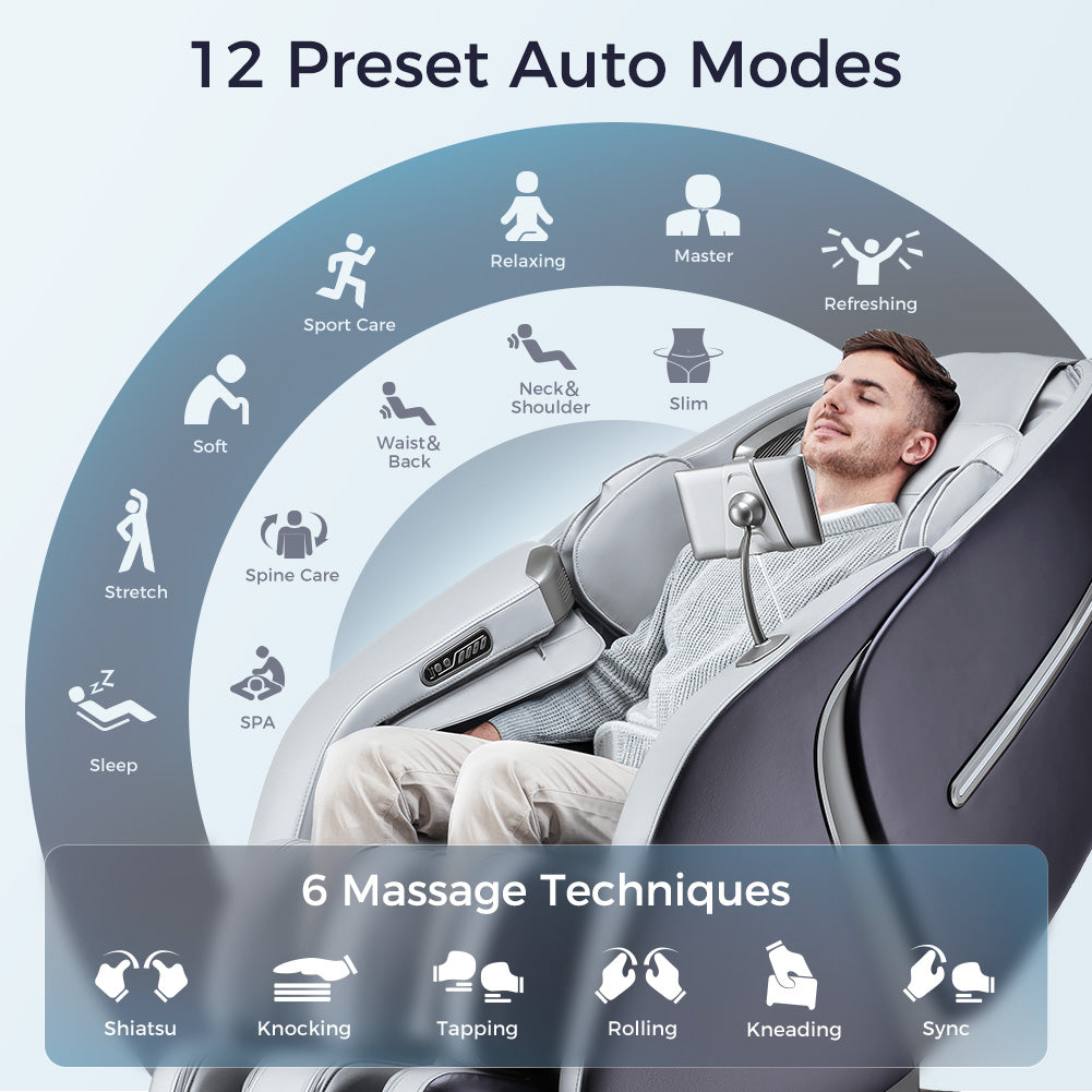 - 4 massage heads, 12 preset automatic modes, 6 Massage Techniques, 6 levels 3D intensity and 3 levels zero gravity angles.